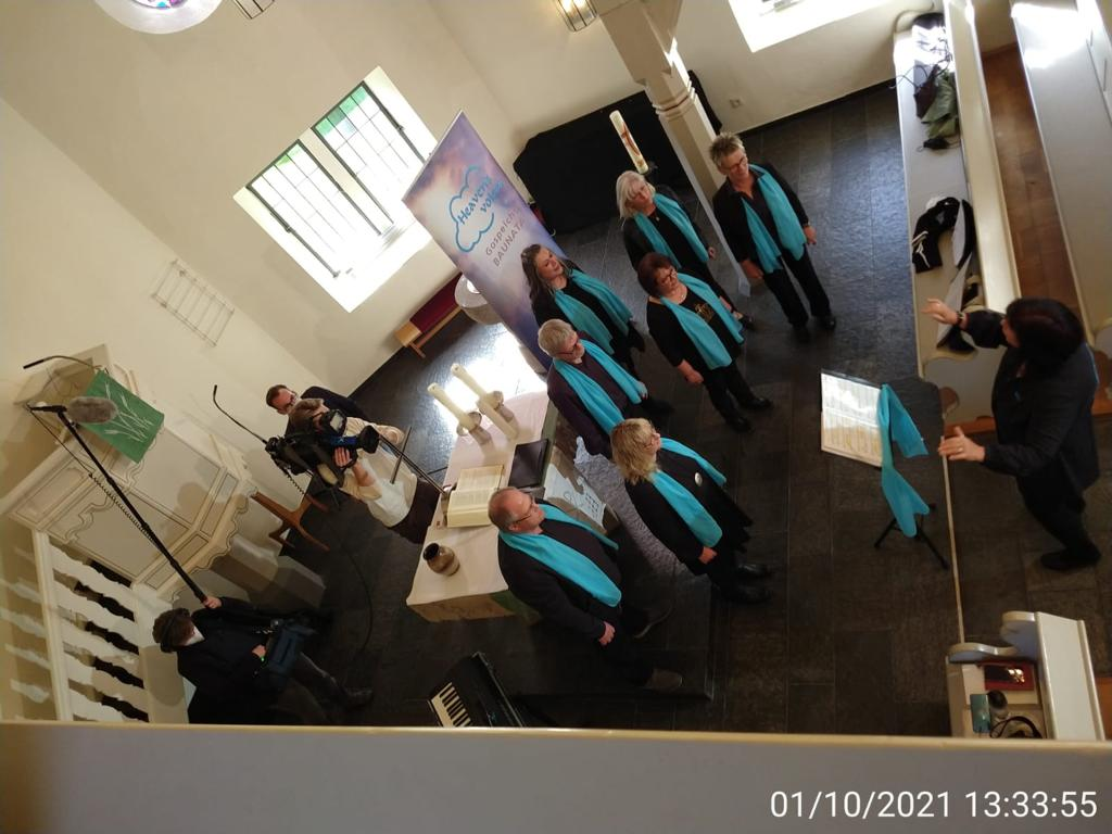 Was war das für eine Freude, als im Hessischen Rundfunk bei der Hessenschau der Baunataler Stadtteil als "Dolles Dorf" gezogen wurde. Ruck zuck wurde diese Information an viele Anwohner, Vereine und Verbände weitergeleitet. So traf man sich in großer Runde bereits am Donnerstagabend im Dorfgemeinschaftshaus. Die Teilnehmer waren stolz, den Redakteuren vom HR von ihren vielen Attraktionen im Ort berichten zu können. Dazu gehört eben auch der Gospelchor Heavens Voices. Man verabredete sich für den nächsten Tag für die Dreharbeiten. Der Chor sang sich gerade mit "This little Light of mine" warm, als das Drehteam in die Kirche kam. Kaum war die Kamera an, stieg natürlich die Nervosität. Aber dennoch hatten alle Teilnehmer großen Spaß an den Dreharbeiten. Das lag wohl auch daran, dass das Drehteam wirklich super sympathisch ist. Leider konnten nicht alle Chormitglieder so kurzfristig dabei sein, aber es entstand trotzdem ein sehr schöner Beitrag, welchen man in der Mediathek noch anschauen kann. Wie die Chorleiterin Ute Arend in dem Interview schon sagte: „Musik ist Balsam für die Seele und wir bringen den Gospel so rüber, dass man mitfühlen kann, was gesungen wird, auch wenn man kein Englisch versteht“. Wenn auch du Lust auf Gospel hast, dann komm gern dienstags um 19.00 Uhr in das Dorfgemeinschaftshaus Guntershausen (Lindenstraße 1 in 34225 Baunatal). Notenkenntnisse sind nicht erforderlich. Bei uns steht die Freude am Singen im Vordergrund. Weitere Informationen über unseren Chor auf www.heavens-voices.de oder unter der Rufnummer 01 78 – 134 86 47